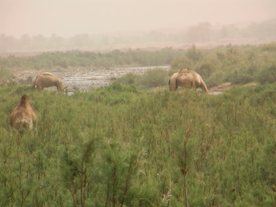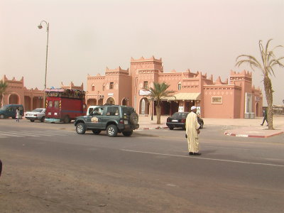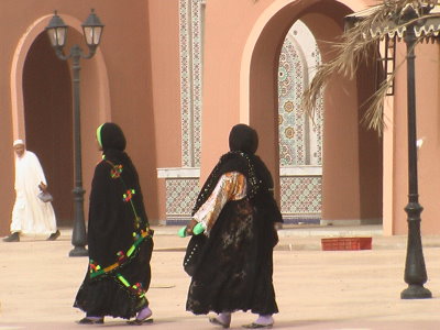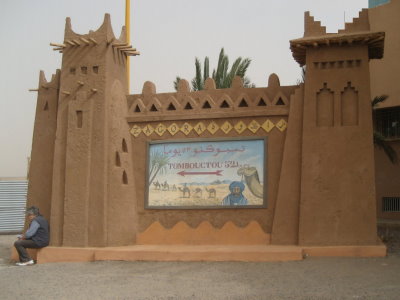 18. April 2011Heute hatten wir den ganzen Tag Zeit, also hieß es bummeln beim Aufstehen, das Frühstück genießen und sich dann ganz allmählich aufmachen zu einem Stadtrundgang.Natürlich führte uns unserer Weg als erstes zu dem in jedem Reiseführer abgebildeten Schild, auf dem man erfährt, dass der Weg nach Timbuktu noch 52 Tage dauert. Es ist inzwischen in eine Wand zwischen zwei kleinen Türmen eingemauert, und ich habe meine Zweifel, ob ich, wenn ich mich in die angegebene Richtung auf den Weg machte, tatsächlich in Timbuktu ankäme. Wie schon gestern abend beim Einfahren festgestellt, macht Zagora einen sehr aufgeräumten Eindruck. Die recht breite Hauptstraße ist asphaltiert, es gibt einen großen Kreisel mit einem üppig Wasser sprühenden Springbrunnen in der Mitte. Überall fanden wir Restaurants. In einem, gegenüber der Moschee, hatte ich Gelegenheit, die unterschiedlich gekleideten Menschen zu beobachten ohne als aufdringlicher Tourist aufzufallen. Den Weg in den Palmenwald Zagoras zeigte uns ein deutscher Caravanfahrer. Er war über 70, erzählte uns sofort wie viel Rente er bekäme und wie lange er schon unterwegs sei - ein merkwürdiger Typ. Schließlich mussten wir, wenn wir nicht unhöflich sein wollten, ihn zu seinem Bus begleiten. Dort fanden wir eine gequält blickende Frau vor, die sich nichts sehnlicher wünschte, als endlich wieder nach Hause zu kommen - offensichtlich hatte sie sich die Fahrt mit dem abenteuerlustigen Freund angenehmer vorgestellt. Wir zogen weiter durch den Palmenwald hinunter zum Fluss Draa. Hier erwarteten uns zwischen den Tamariskenbüschen "grasende" Dromedare. Zurück in der Stadt wurden wir von einem hervorragend deutsch sprechenden Marokkaner in den Souvenierladen seines "Onkels" gelockt. Er hat Wasserbau in Deutschland studiert. Dank seiner Sprachkenntnisse beantwortete er uns viele allgemeine Fragen über das Land, während wir das riesige Angebot an Ketten prüften und Preise verhandelten,. So wurde es ein interessanter Nachmittag, der natürlich nicht endete, ohne dass wir jeder mit Berberketten das Geschäft verließen. Es blieb noch ein wenig Zeit, am Pool zu entspannen, dann gingen wir, das Gesicht und die Haare unter unseren Tüchern versteckt, durch den aufgekommenen Sandsturm zum Abendessen. Die Terrassen der Restaurants waren mit senkrechten Markisen vor dem scharfen Wind geschützt, der Sand jedoch drang durch die kleinsten Ritzen. Dennoch setzten wir uns an die grob gereinigten Tische und genossen leckeres Essen und die herrlichen Säfte. Auf dem Rückweg ließ der Sturm etwas nach. In dem geschützten Innenhof unseres Hotels beendeten wir den schönen Tag am Pool bei Campari und Pastis. |